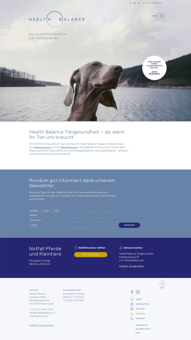 Bei Health Balance dreht sich alles um die Gesundheit von Vierbeinern. Unsere Aufgabe war, das vielseitige Angebot des Kompetenzzentrums in einem stimmigen Auftritt zu vereinheitlichen. Wir haben die visuelle Identität des Unternehmens entwickelt: mit Strategie-Workshop, Website, Bildkonzept, Drucksachen und Signaletik.