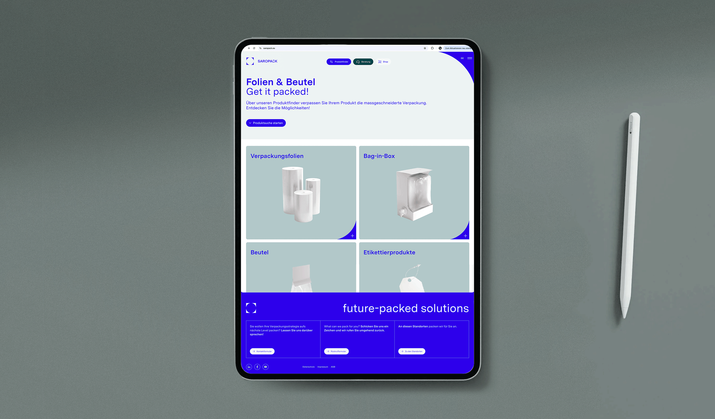 Die neue Website ist das Herzstück des Rebrandings – mit klarem Fokus auf UI/UX, intuitiver Navigation und hoher Usability. Sie transportiert eine starke Botschaft in die Verpackungszukunft und stärkt die digitale Präsenz von Saropack nachhaltig. Eine klar strukturierte Produktwelt für Folien und Maschinen sowie ein innovativer Produktfinder tragen zu einem nahtlosen Nutzungserlebnis bei. Ein durchdachtes Bildkonzept mit authentischen Reportageaufnahmen, einheitlichen Renderings und einer umfangreichen Icon-Serie rundet das Gesamtbild ab. Der neue Webauftritt spiegelt die Innovationskraft und das Engagement für umweltfreundliche Verpackungslösungen optimal wider.